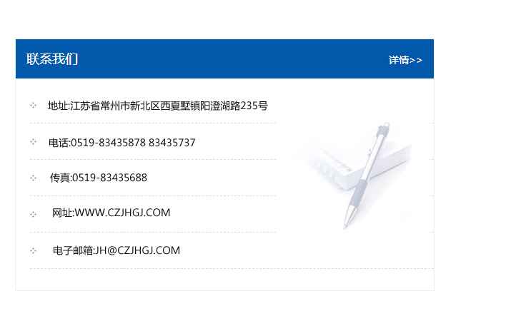 傳真:0519-83435688    郵編:213135    網址:WWW.czjhgj_com.xdbiotec.com    電子郵箱:JH@czjhgj_com.xdbiotec.com